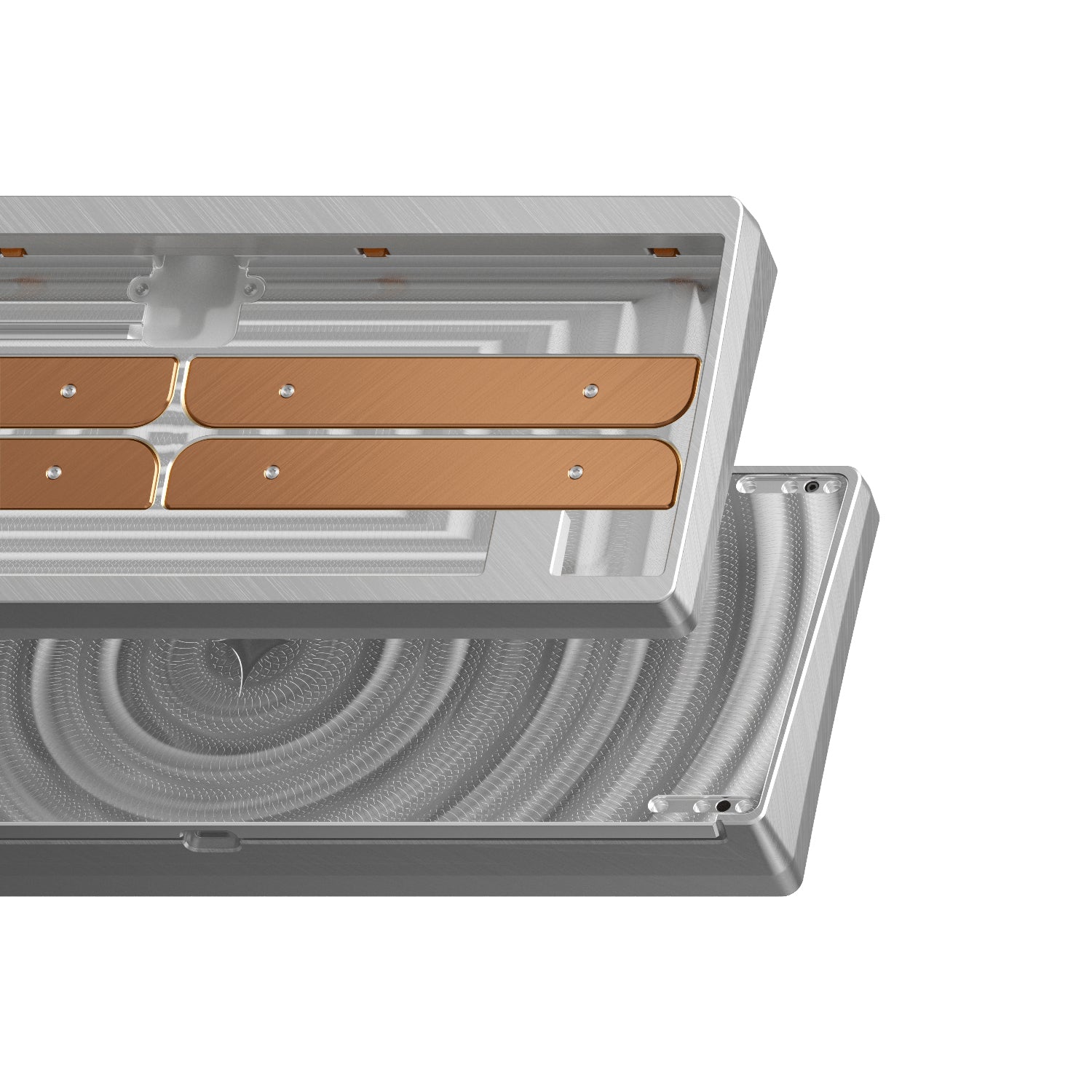 - Stainless steel bottom case with 4 internal copper weights ( unfinished/raw stainless steel & nano clear coated weights )