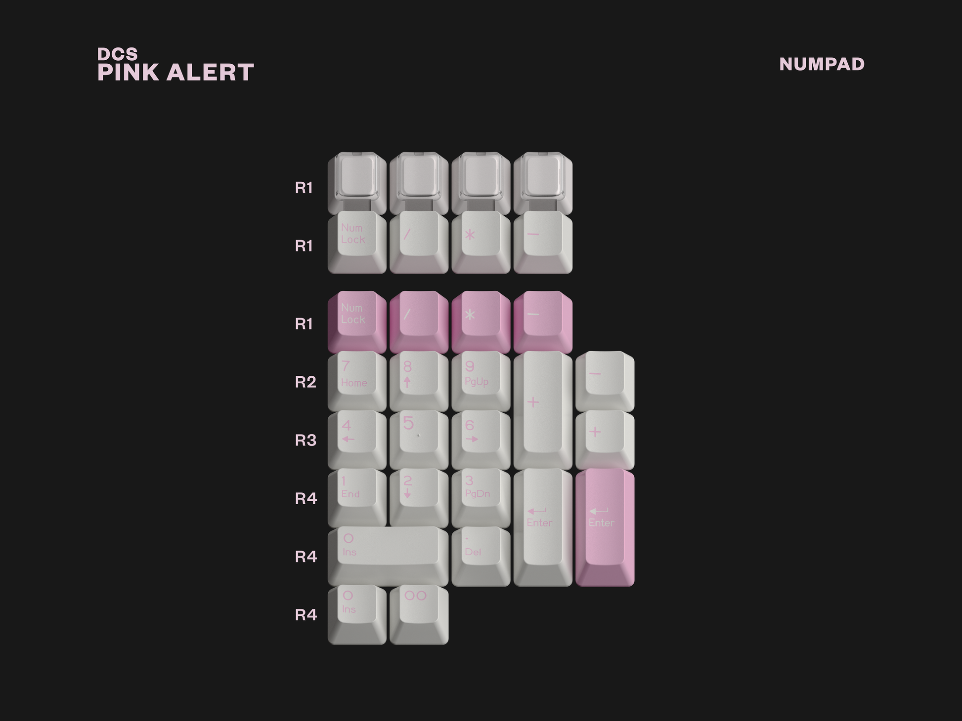 DCS Pink Alert Keycaps is back! Originally ran through Alessio and given permission to James for a rerun of this classic set. The base kit features a unique kitting that includes the beige base, alert row, basic TKL support, basic alice support, and basic HHKB support and excludes 40s, 6.25u layout, numpad, UKISO.