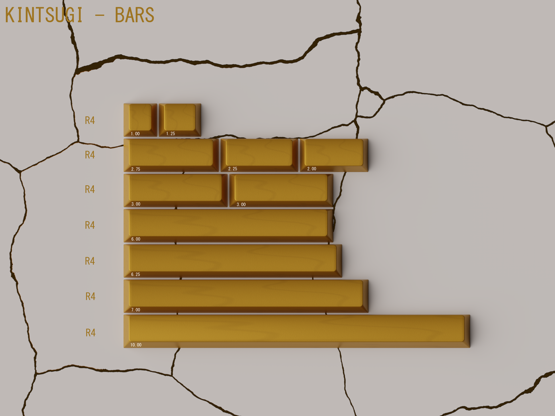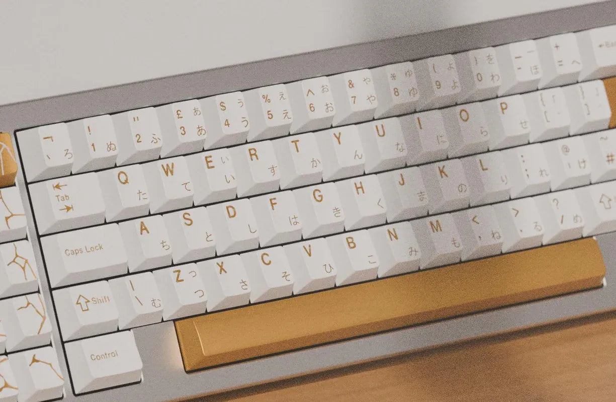Keykobo Kintsugi Shiro features a white base with metallic gold accents. To achieve a striking metallic texture, a special powder is blended with the ABS plastic for the gold accent colors. This powder creates natural "streaks" on the keycap surface, making every set unique with its own distinct pattern.