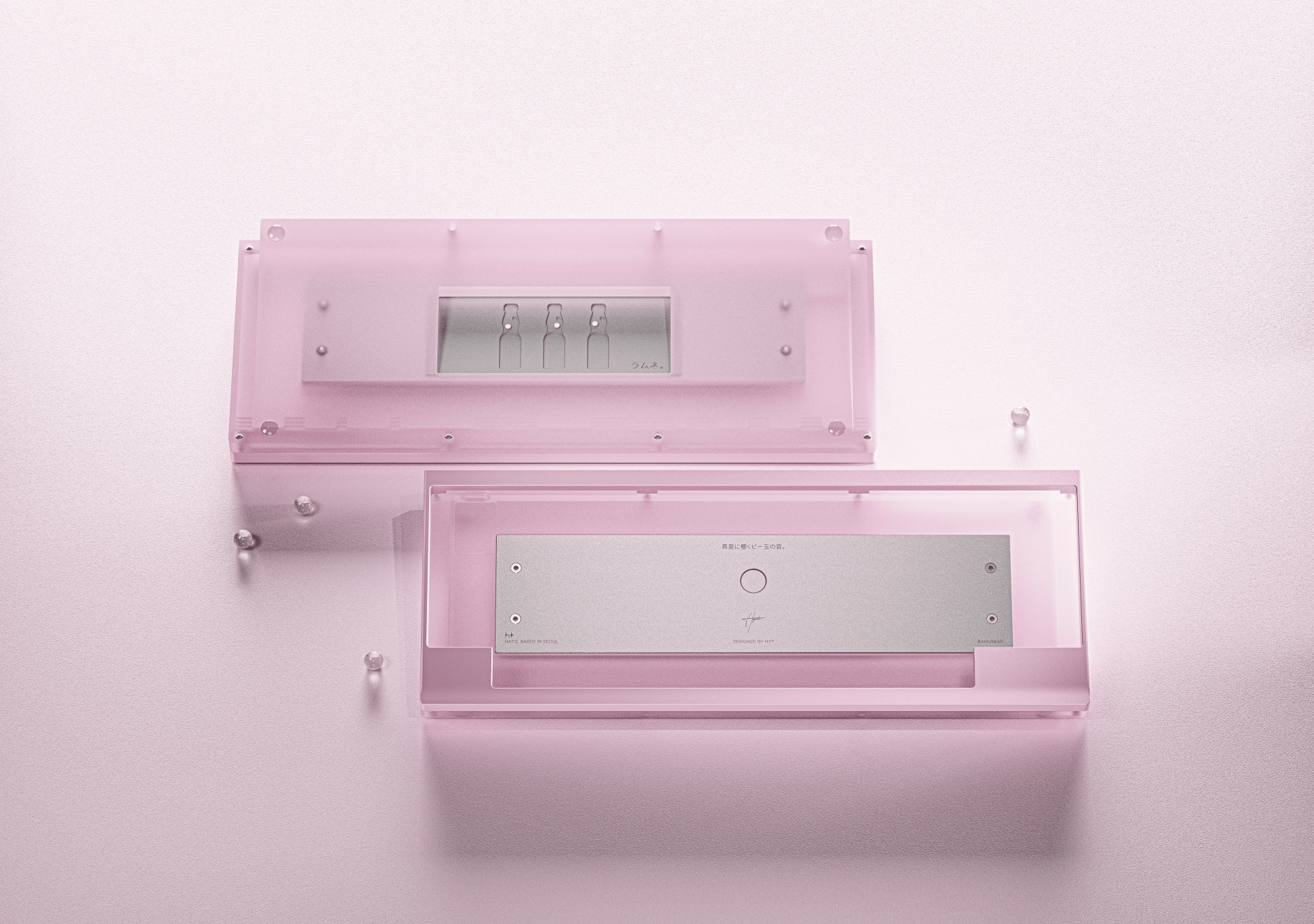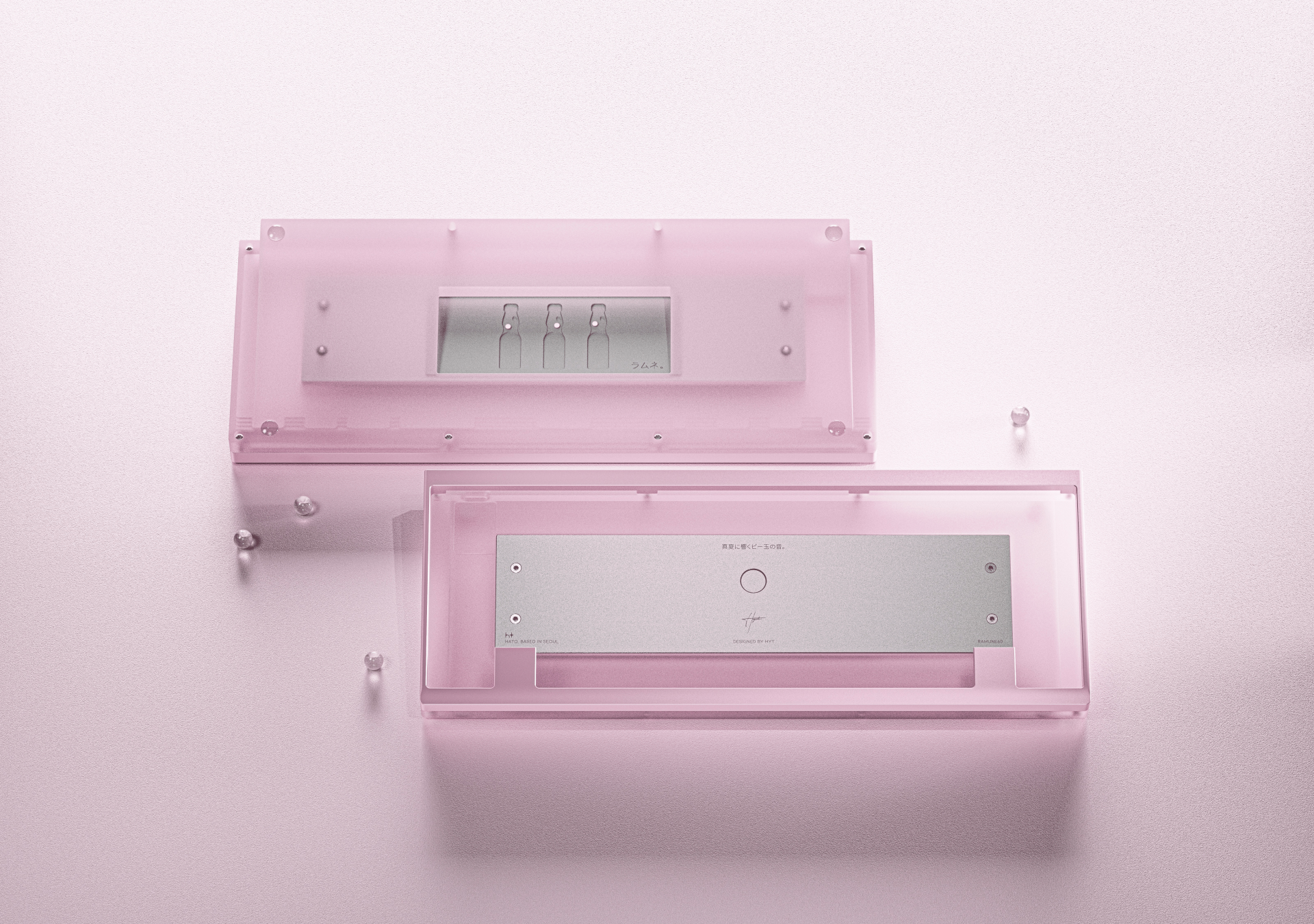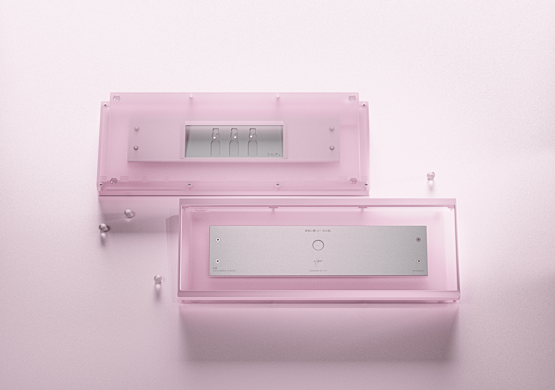 - The design of this keyboard was inspired by Ramune, the iconic Japanese soda known for its playful charm and distinctive glass bottle. With its clear lower half filled with fizzy soda, opaque top cap, and signature glass marble sealed inside, the Ramune bottle serves as a direct motif for the keyboard’s form and color palette.