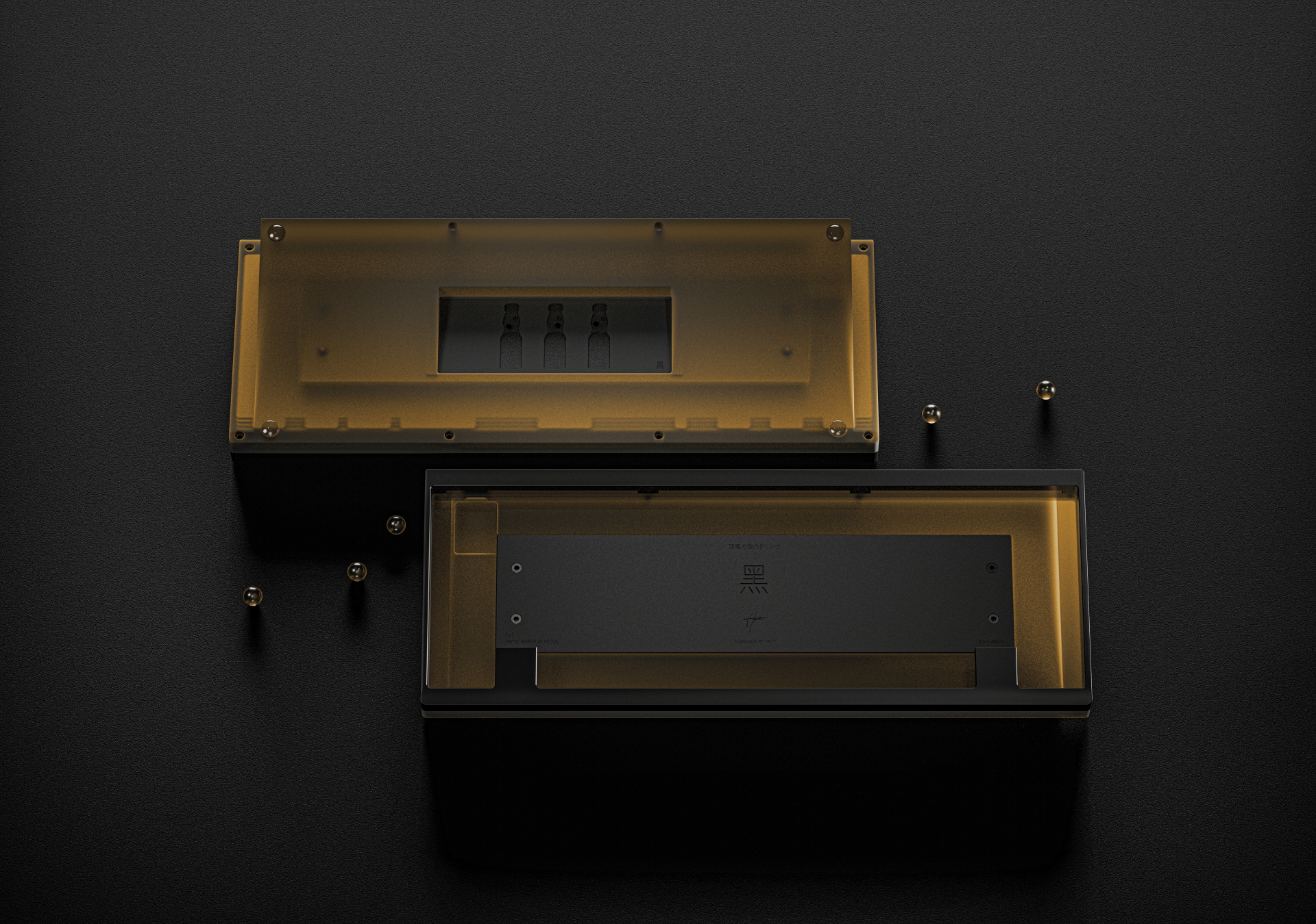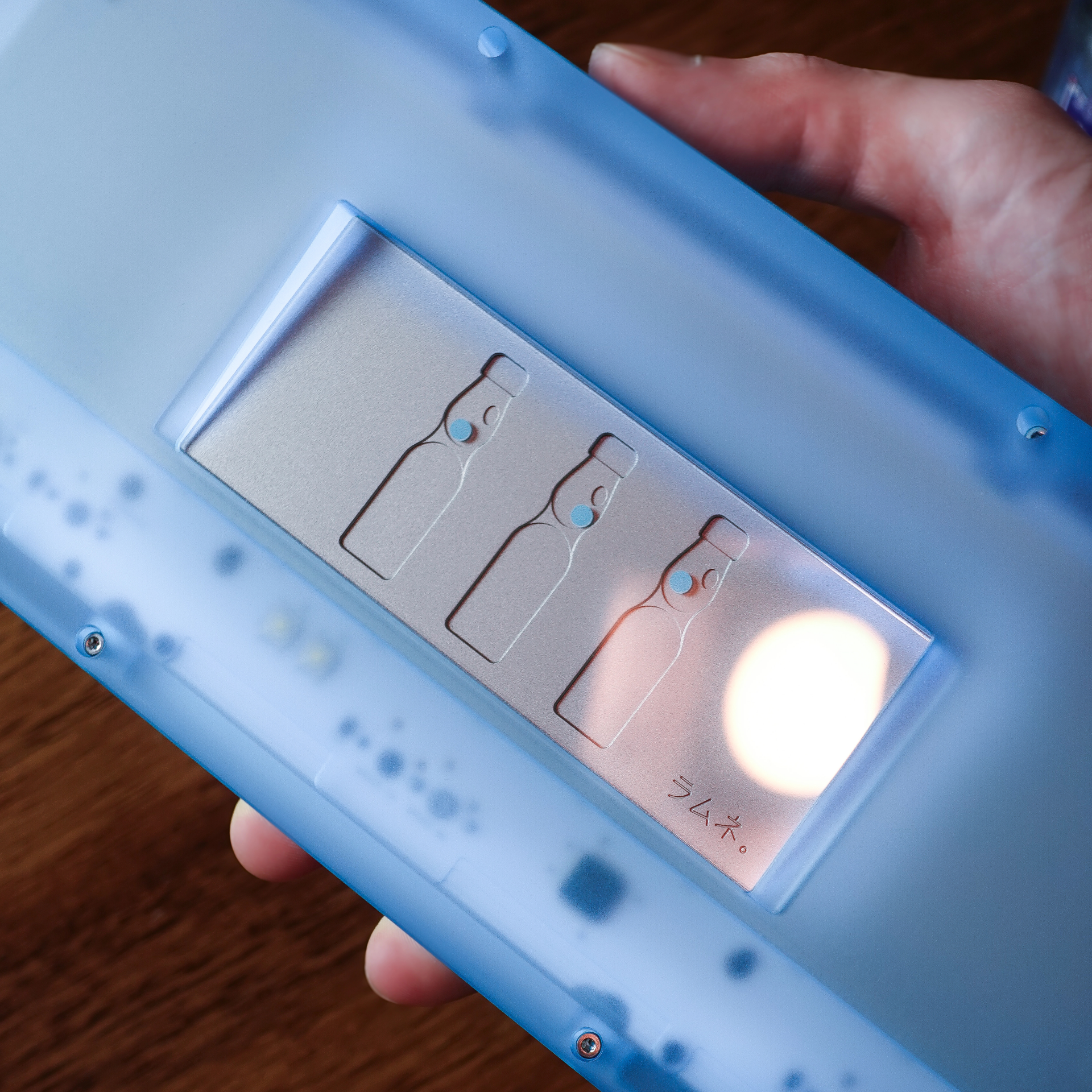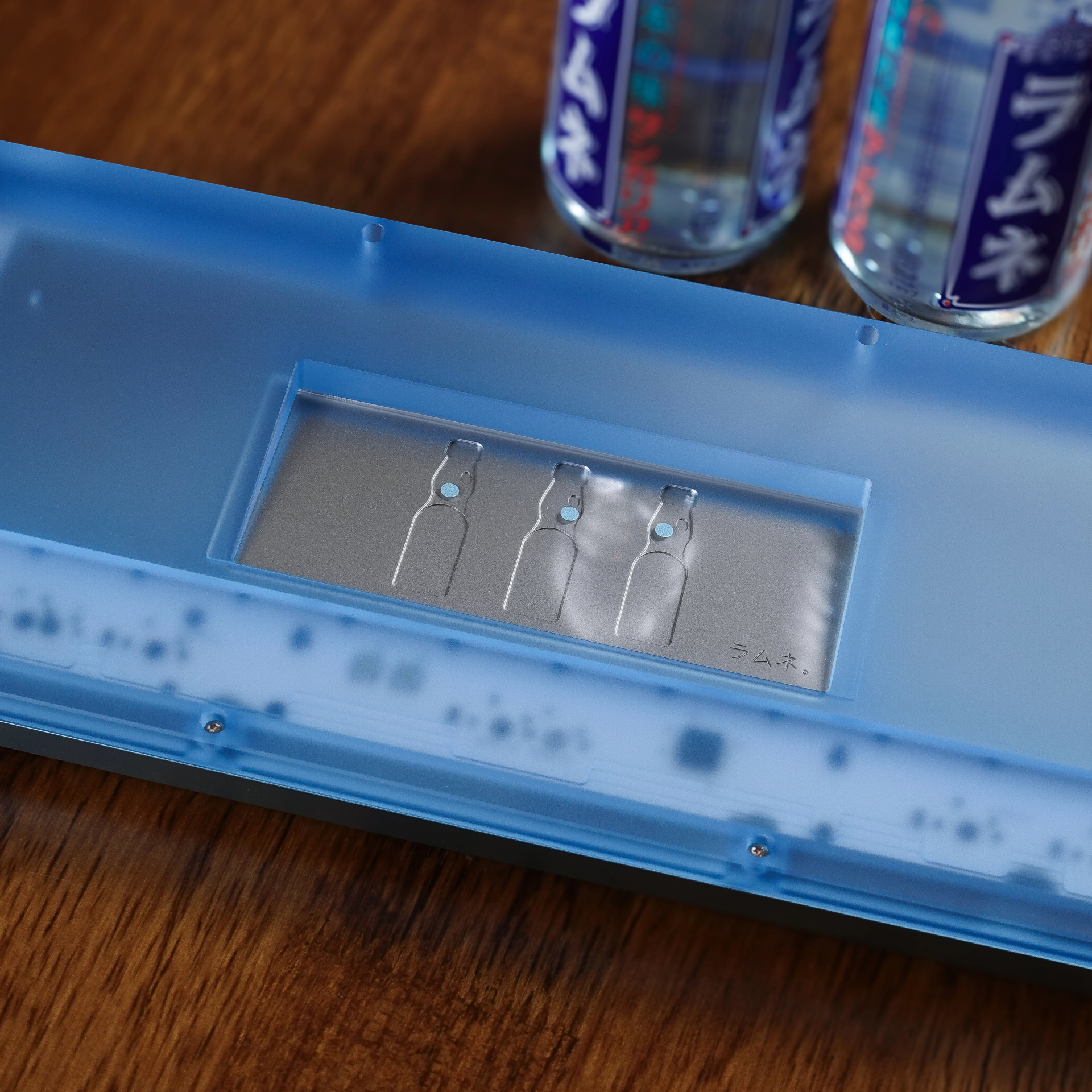 - The design of this keyboard was inspired by Ramune, the iconic Japanese soda known for its playful charm and distinctive glass bottle. With its clear lower half filled with fizzy soda, opaque top cap, and signature glass marble sealed inside, the Ramune bottle serves as a direct motif for the keyboard’s form and color palette.
